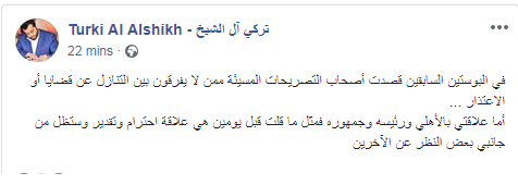 وقال تركى آل الشيخ علي صفحته، "في البوستين السابقين قصدت أصحاب التصريحات المسيئة ممن لا يفرقون بين التنازل عن قضايا أو الاعتذار ... أما علاقتي بالأهلي ورئيسه وجمهوره فمثل ما قلت قبل يومين هي علاقة احترام وتقدير وستظل بغض النظر عن الآخرين".