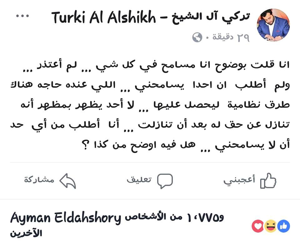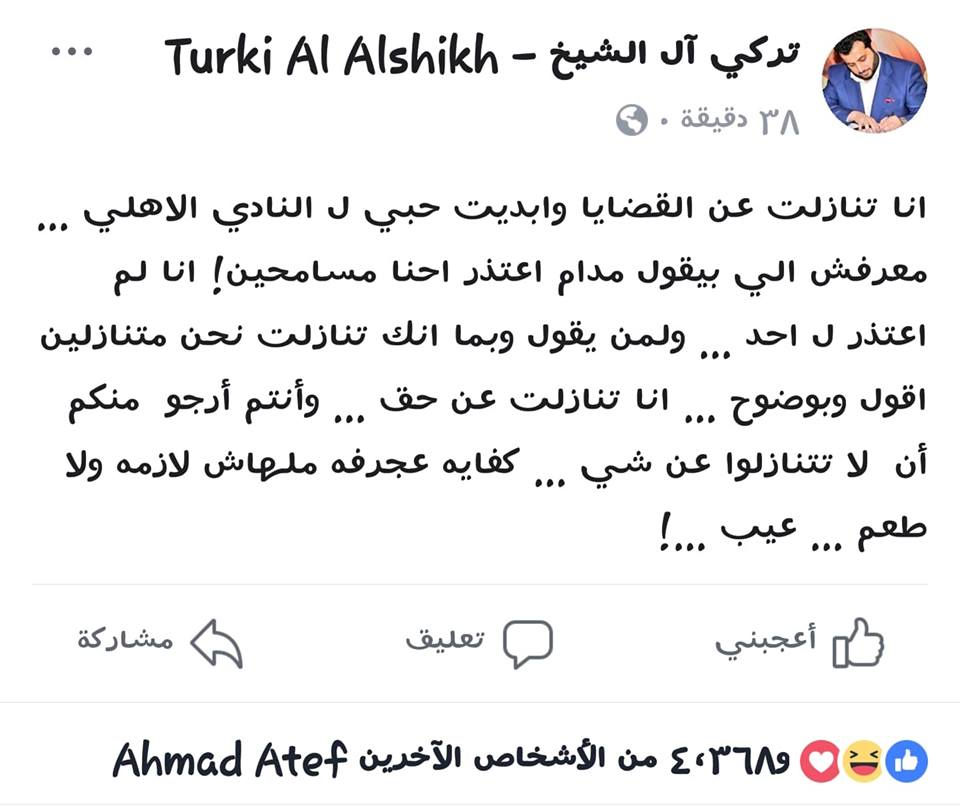 اخبار النادى الاهلى ،،،،أوضح تركى آل الشيخ رئيس هيئة الرياضة السعودية، أنه كان يقصد فيما نشره على صفحته بموقع التواصل الاجتماعي "فيس بوك" ، أصحاب التصريحات المسيئة ممن لا يفرقون بين التنازل عن قضايا أو الاعتذار.