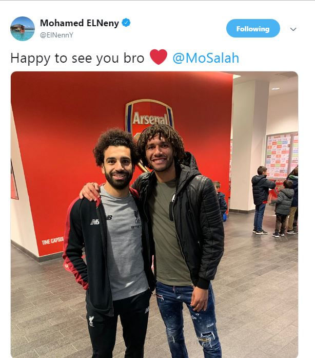 نشر اللاعب محمد النني نجم أرسنال الإنجليزي، صورة تجمعه باللاعب الدولي محمد صلاح نجم نادي ليفريول وهداف الدوري الإنجليزي، بعد اللقاء الذي جمع بين فريقيهما أمس السبت، وانتهى بالتعادل 1-1.
