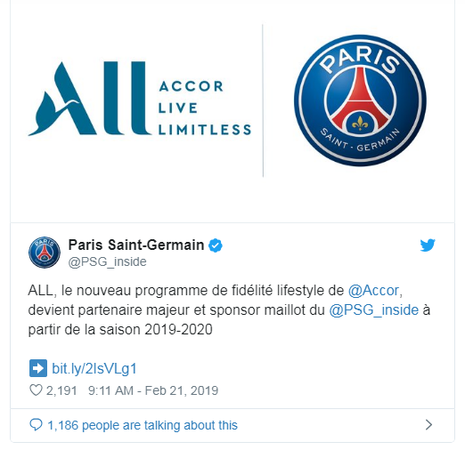 أعلن نادي باريس سان جيرمان الفرنسي لكرة القدم اليوم الخميس أنه وقع عقدا مع مجموعة "أكور جروب" الفرنسية للفنادق لتكون الراعي الرئيسي لقميص الفريق بداية من الموسم المقبل بدلا من شركة خطوط الطيران الإماراتية.